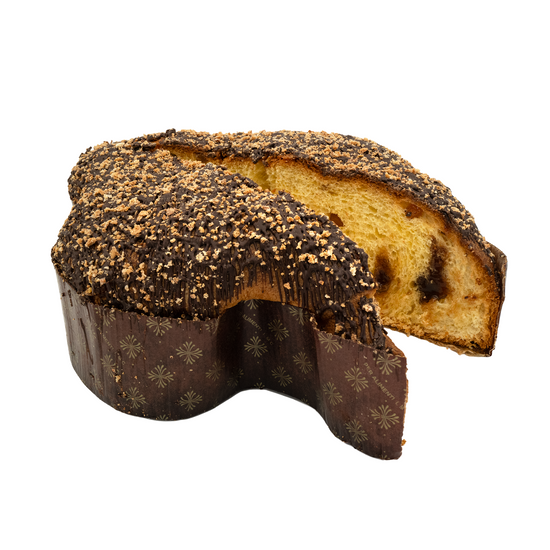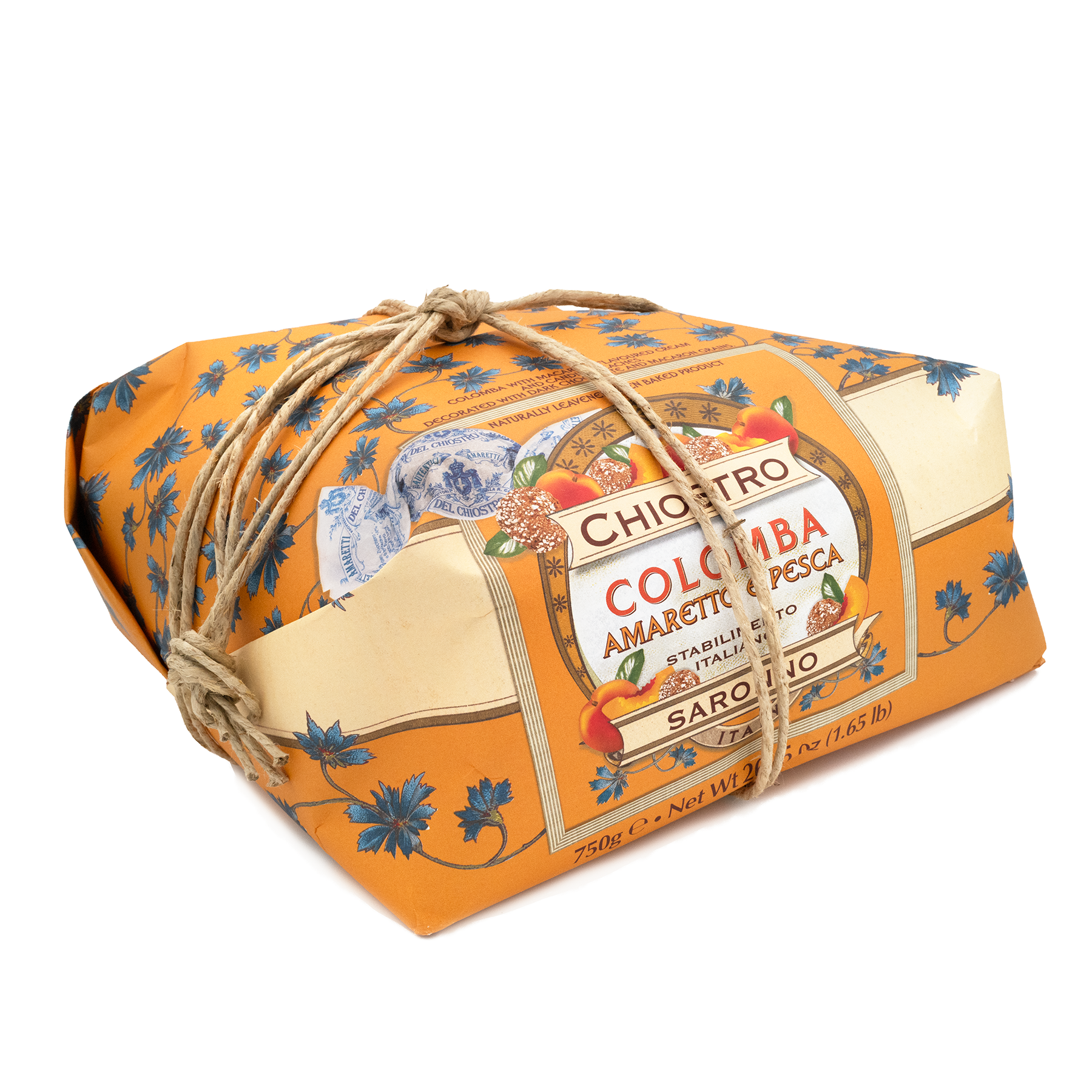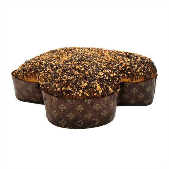 Handwrapped Easter dove cake filled with amaretto cream, candied peach and covered with plain chocolate and amaretto grains