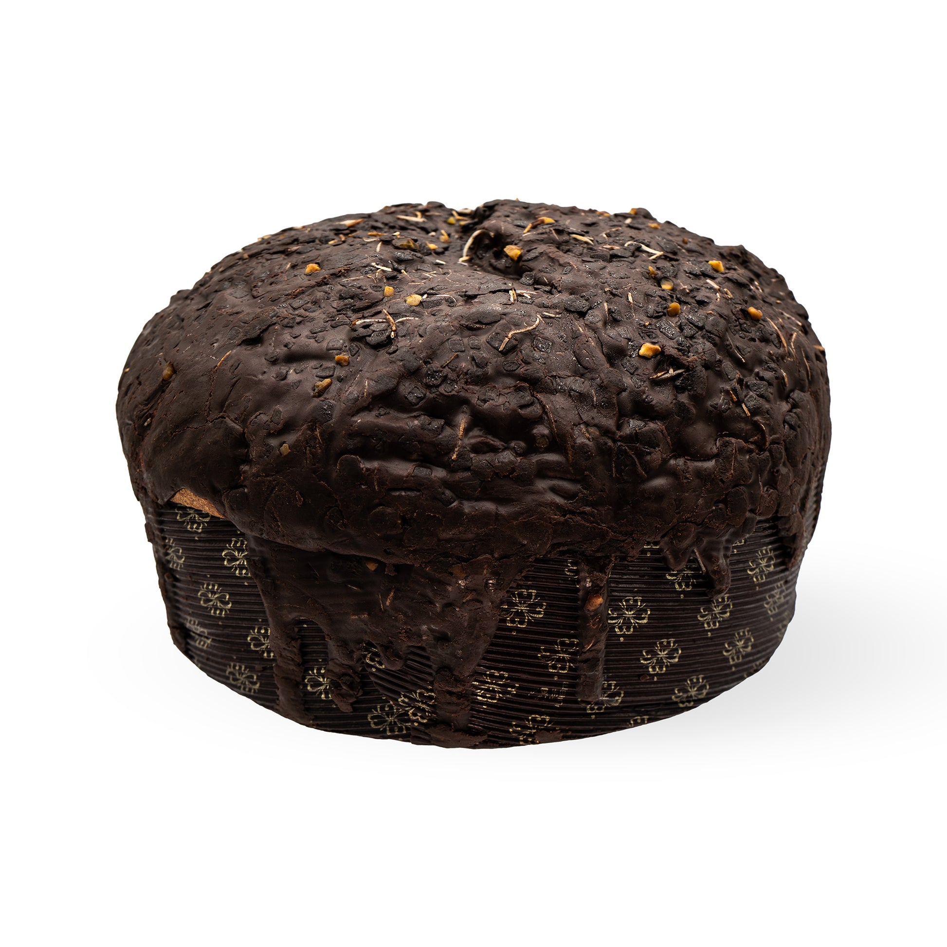 Hand-wrapped panettone with pistachio cream, with cocoa coating and decorated with dark chocolate flakes, pistachio grains and kadayif paste without candied citrus-peel and raisins
