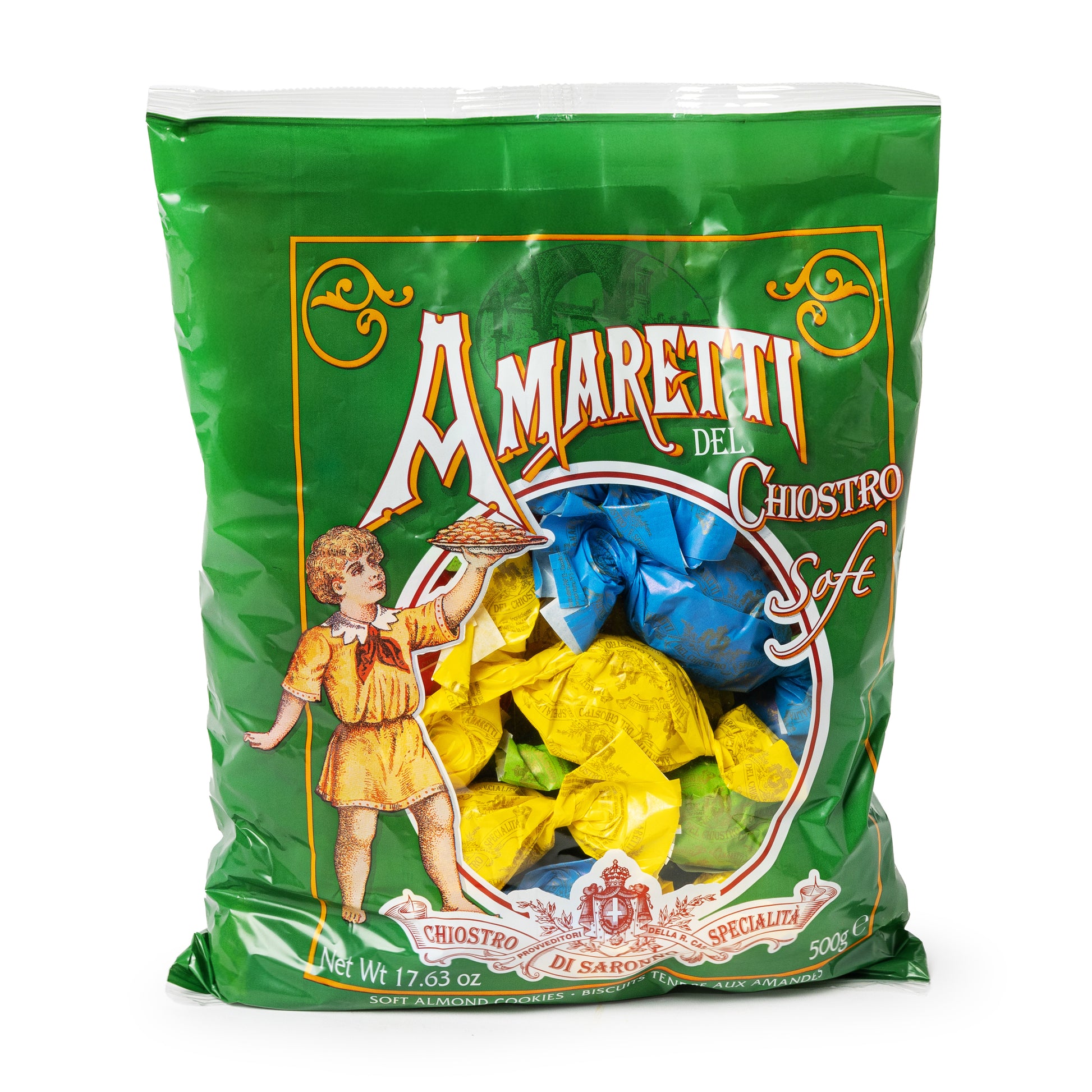 Amaretti morbidi incartati singolarmente ed avvolti in elegante carta colorata in sacchetto verde. Senza glutine