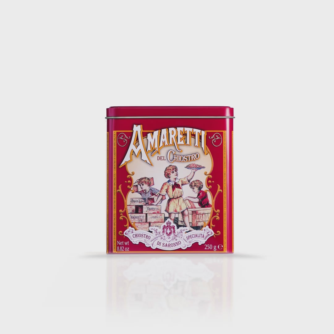 Amaretti croccanti incartati singolarmente ed avvolti in elegante carta velina colorata in latta cubica in metallo. Senza glutine