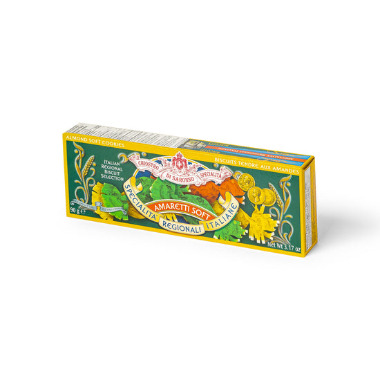 Amaretti morbidi incartati singolarmente ed avvolti in elegante carta velina colorata in scatola di cartone di stile tradizionale. Senza Glutine.
