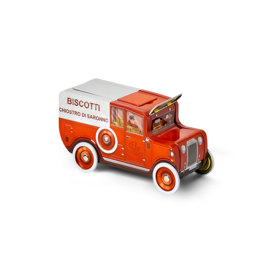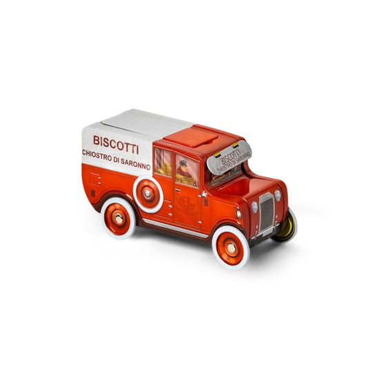 Amaretti croccanti incartati singolarmente ed avvolti in elegante carta velina colorata in lattina giocattolo che riproduce un camioncino con ruote vere che girano. Senza glutine.