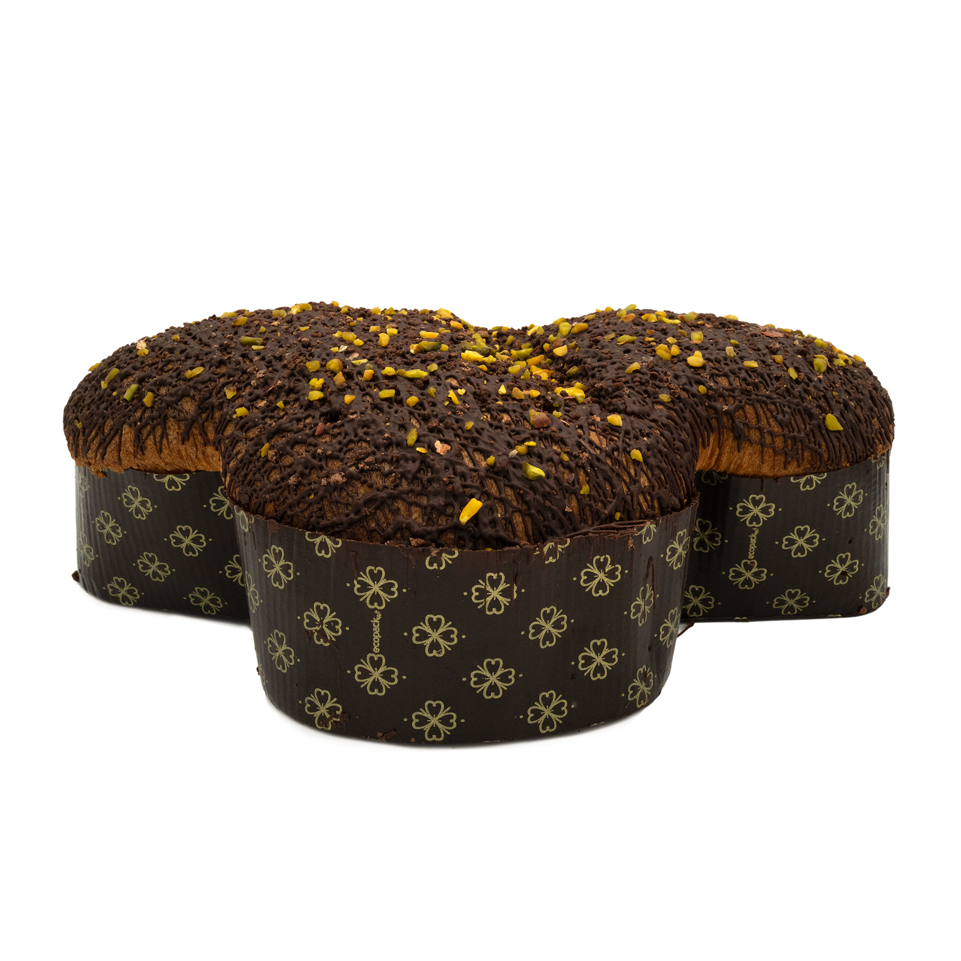 Colomba con crema al pistacchio e ricoperta con cioccolato fondente e granella di zucchero, incartata a mano