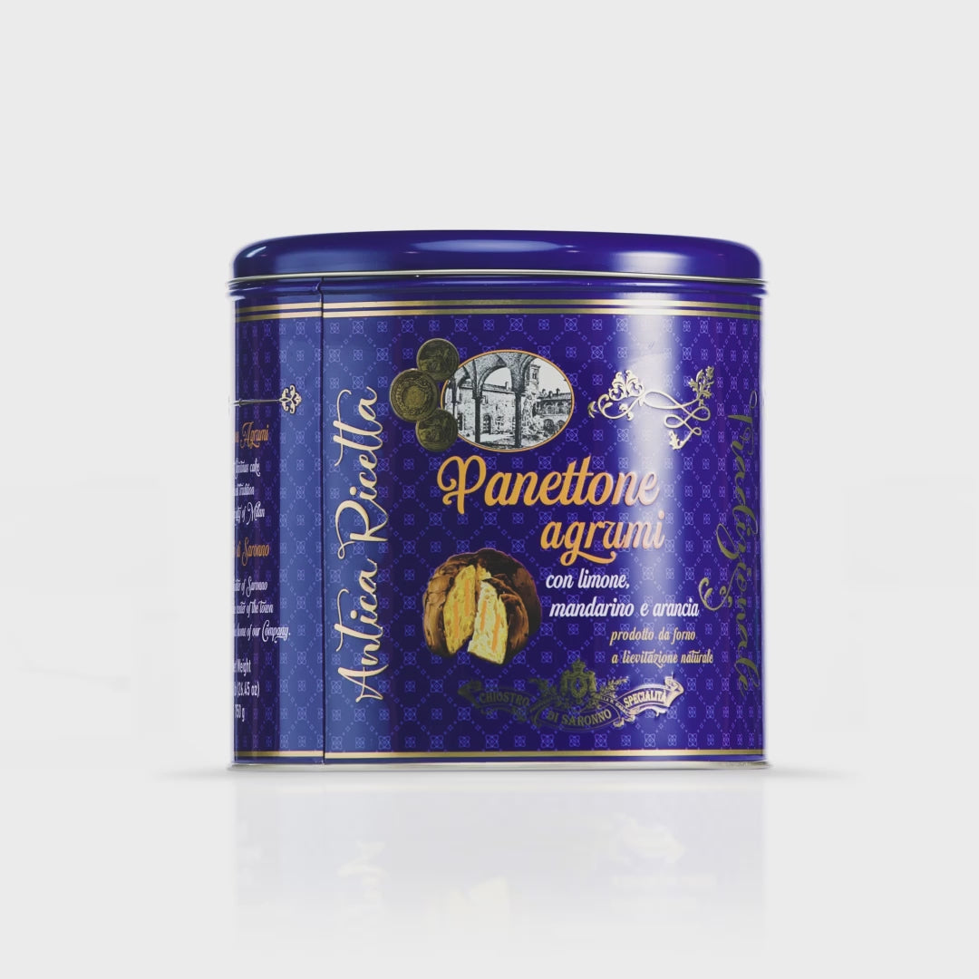 Panettone con scorze di limone, pasta al mandarino e crema di arancia in latta di metallo edizione luxury