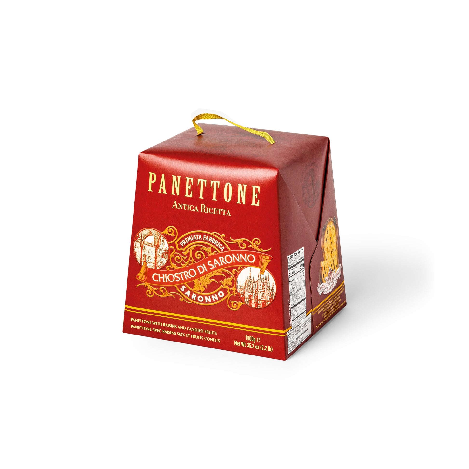 Panettone classico con uvetta e scorze candite, nel tipico astuccio di cartone