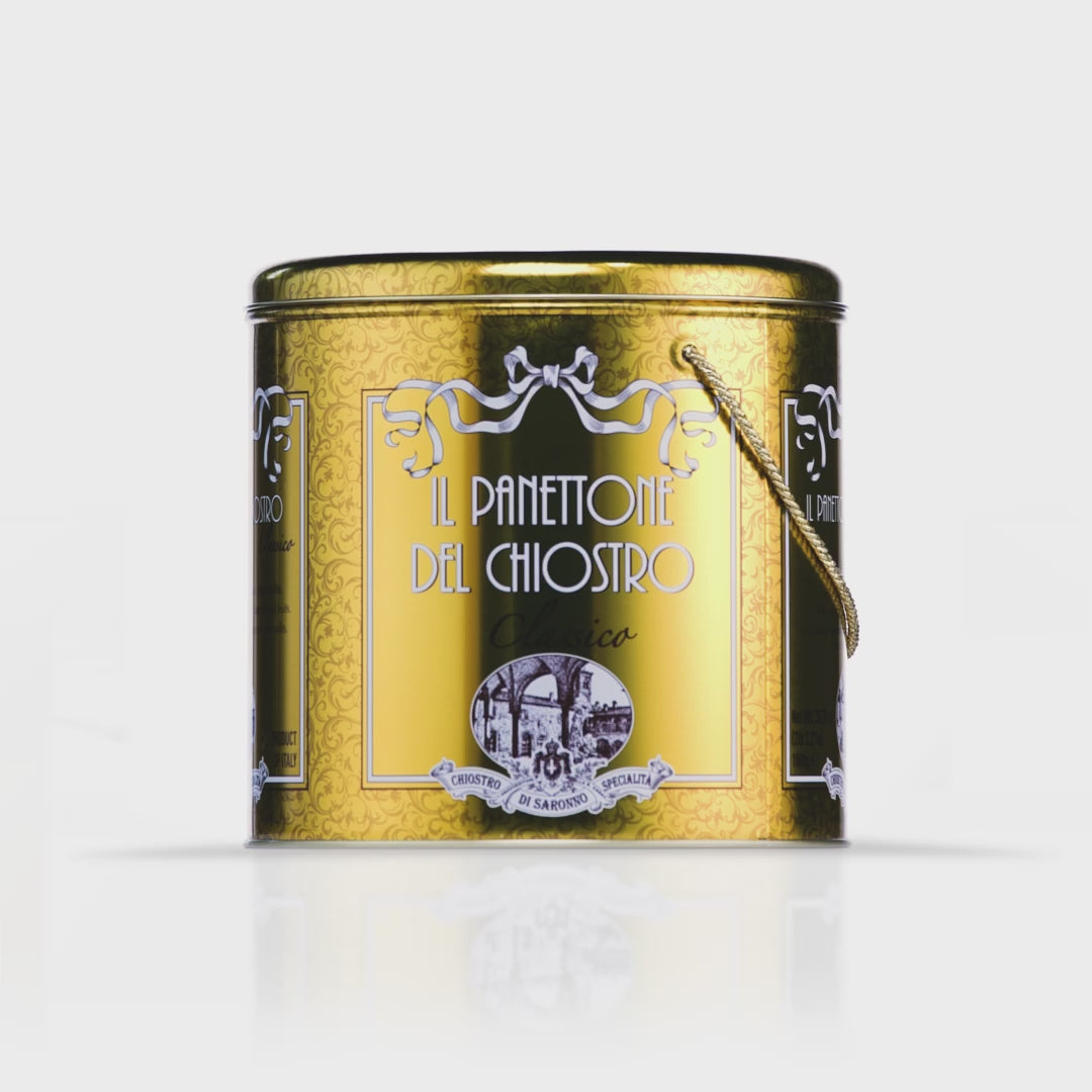 Panettone classico con uvetta e canditi in latta di metallo gold