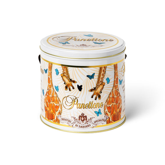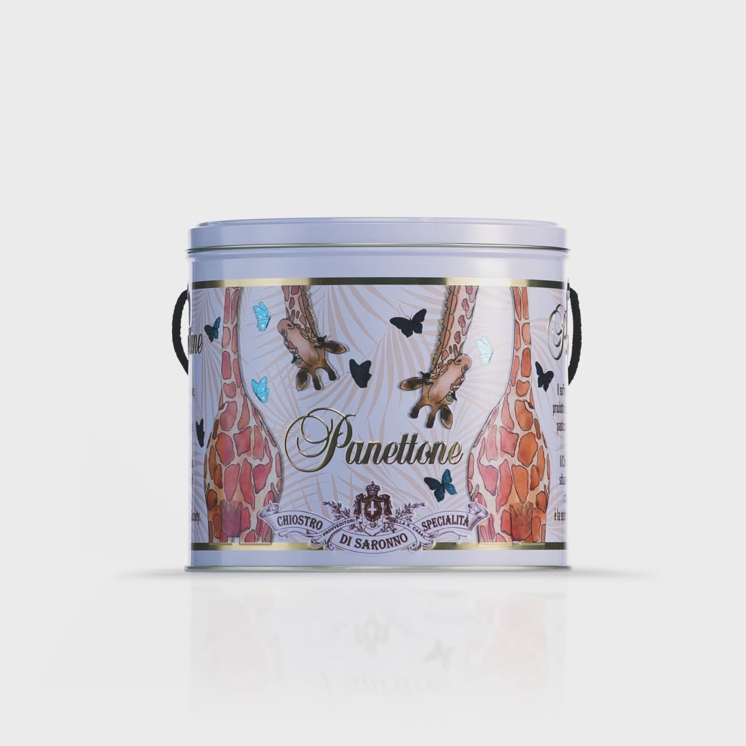 Panettone classico con uvetta e scorze candite,in latta di metallo ironica