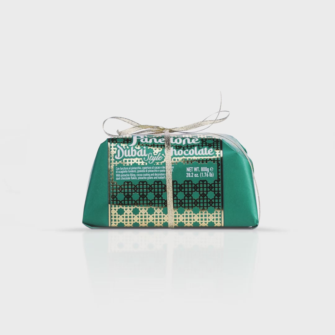 Panettone con farcitura al pistacchio, copertura al cacao e decorazione di scagliette fondenti, granella di pistacchio e pasta kadayif, senza agrumi canditi ed uvetta. Incartato a mano