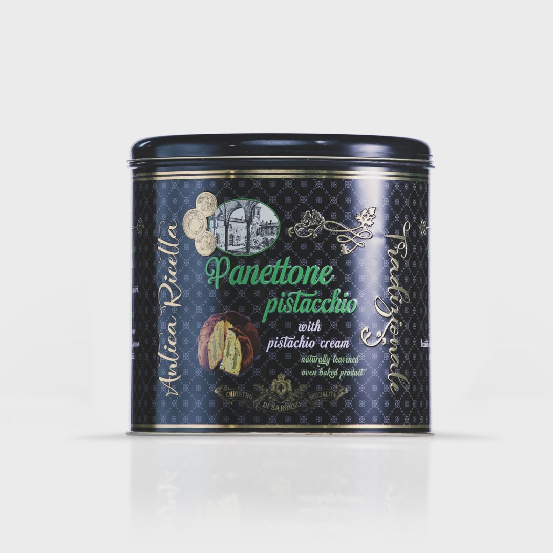 Panettone con crema di pistacchio, senza uvetta e canditi in latta di metallo edizione luxury